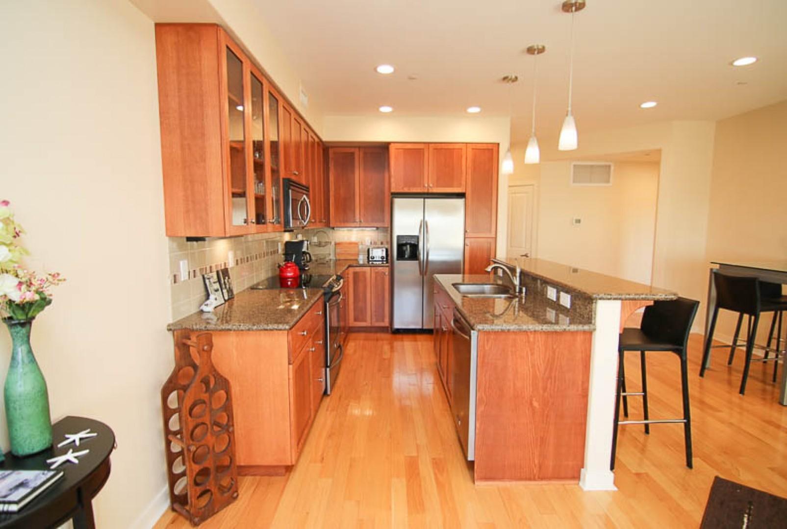 Designer kitchen with gourmet flat island with granite counter tops.